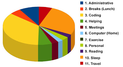 If you compare this with the previous day in the life entry there are a few substantial differences. Even though I am spending approximately 16 hours and 14 minutes away from home, the coding time still only amounts to half of my day. All the other aspects including meetings, admin and help have gone up, and nothing has gone down (on the work side).